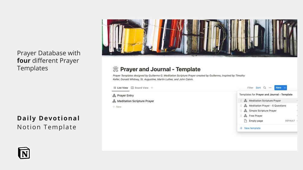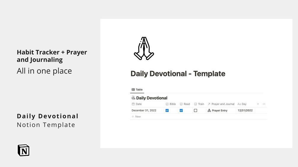 Daily Devotional by Notion Church is a powerful Notion Template that offers four distinctive templates tailored specially for developing a prayer and journaling habit so you can deepen your relationship with God.
